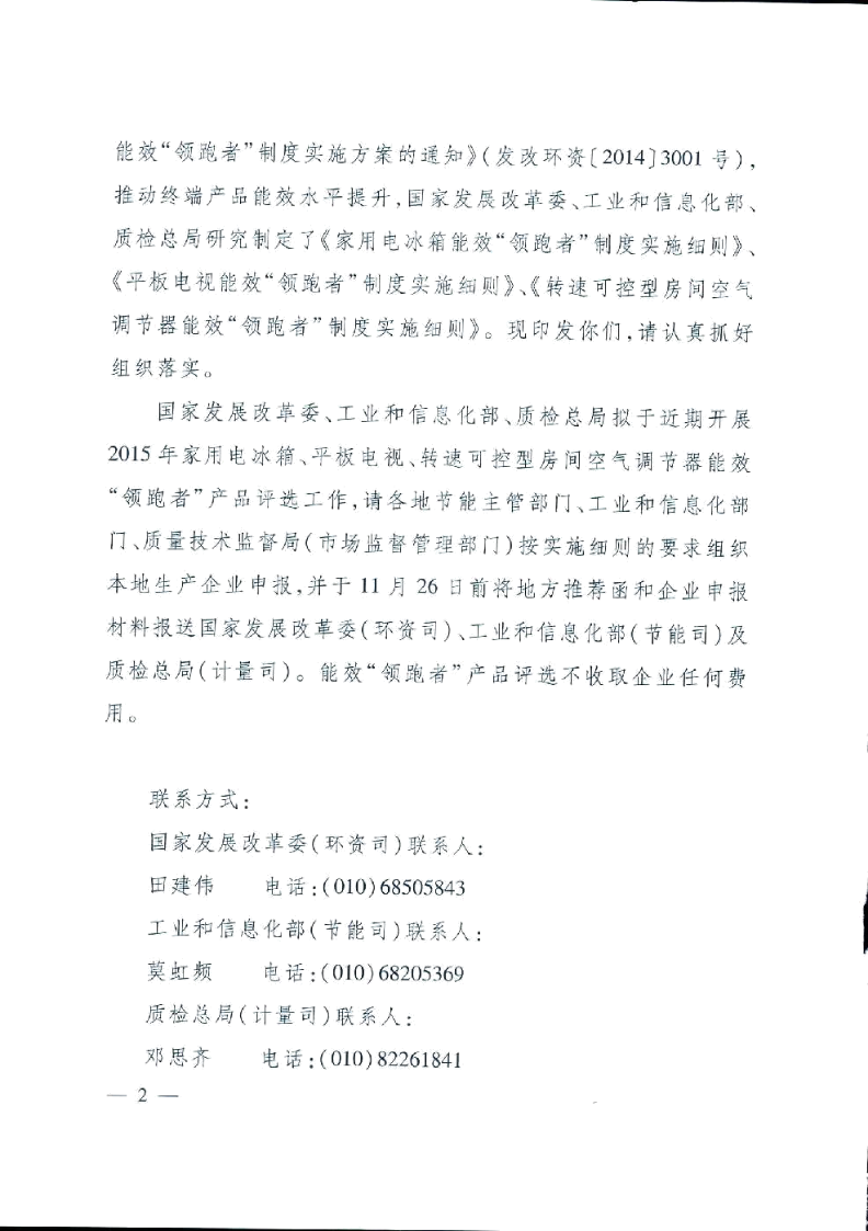 关于印发《家用电冰箱能效“领跑者”制度实施细则》《平板电视能效“领跑者”制度实施细则》《转速可控型房间空气调节器能效“领跑者”制度实施细则》的通知